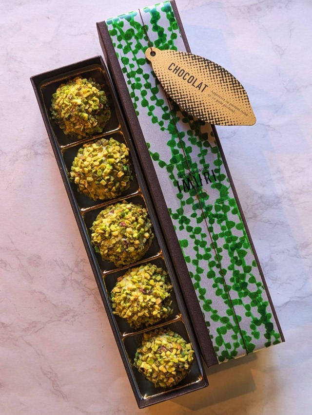 ピスタチオトリュフのみの詰め合わせ。 キルシュが効いたピスタチオガナッシュに クラッシュピスタチオでコーティング。 濃厚な味わいでピスタチオ好きにはたまらない味に仕上げています。 ピスタチオ好きに是非。 品質保持のため冷凍便にてお届け。 商品到着後は冷蔵保管でお願い致します。 箱の大きさ 縦21㎝×横4.7㎝×高さ3.5㎝ 【内容量】 5粒入り 【賞味期限】到着より冷蔵で14日間