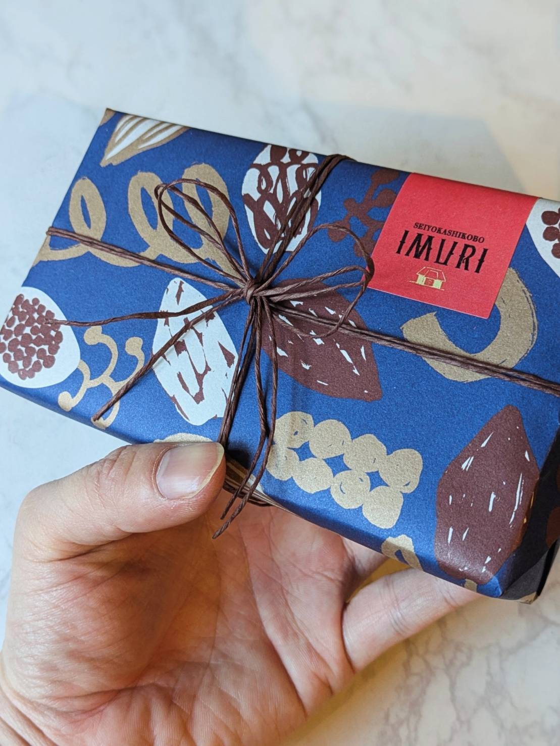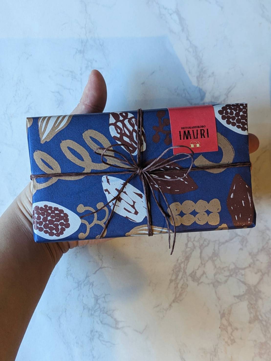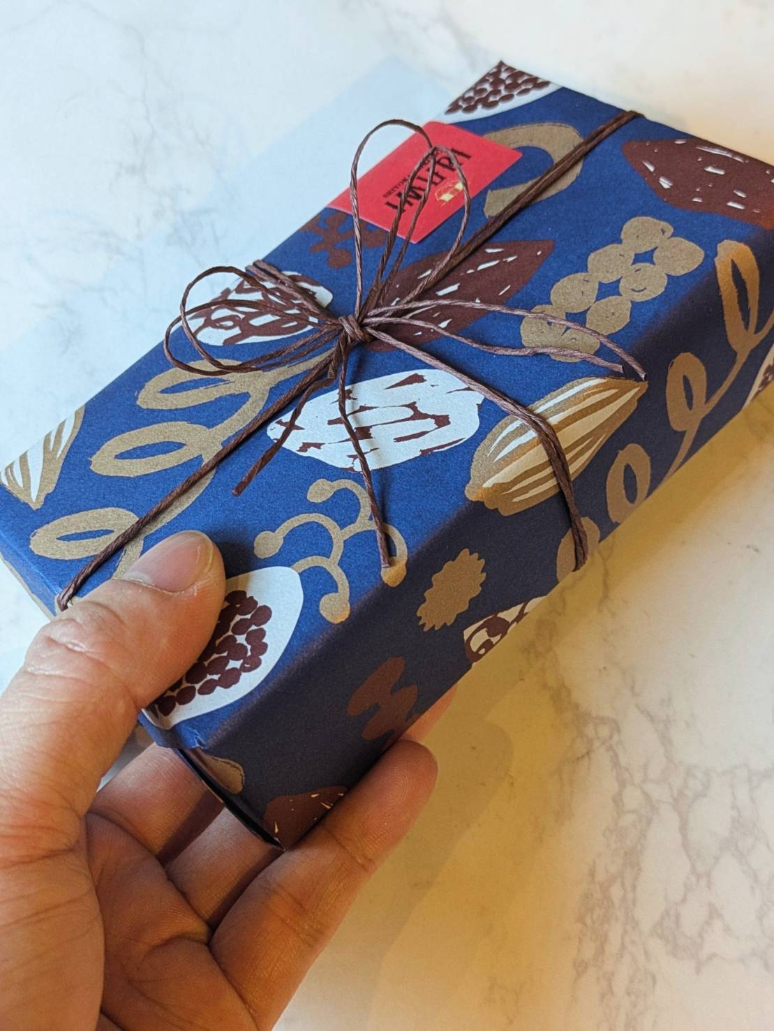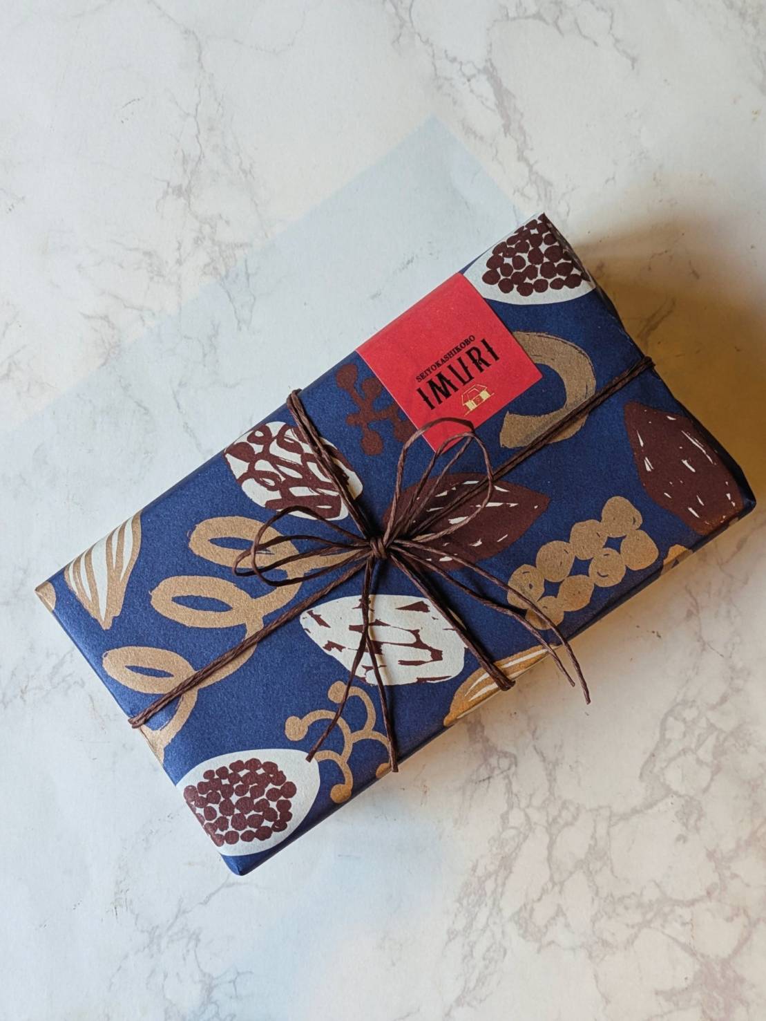 カカオ柄の包装紙で包んだギフトは