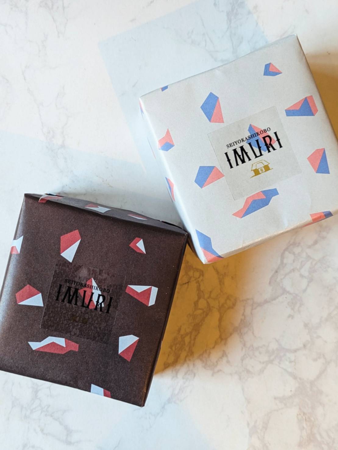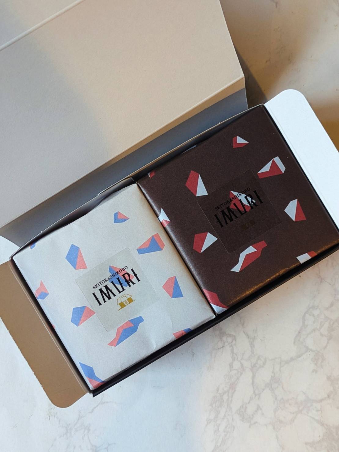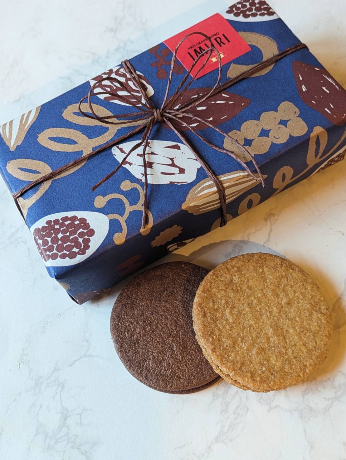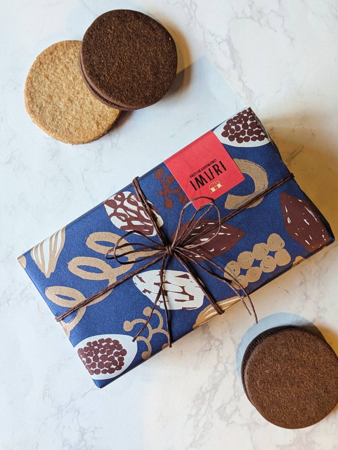 カカオ柄の包装紙で包んだギフトは